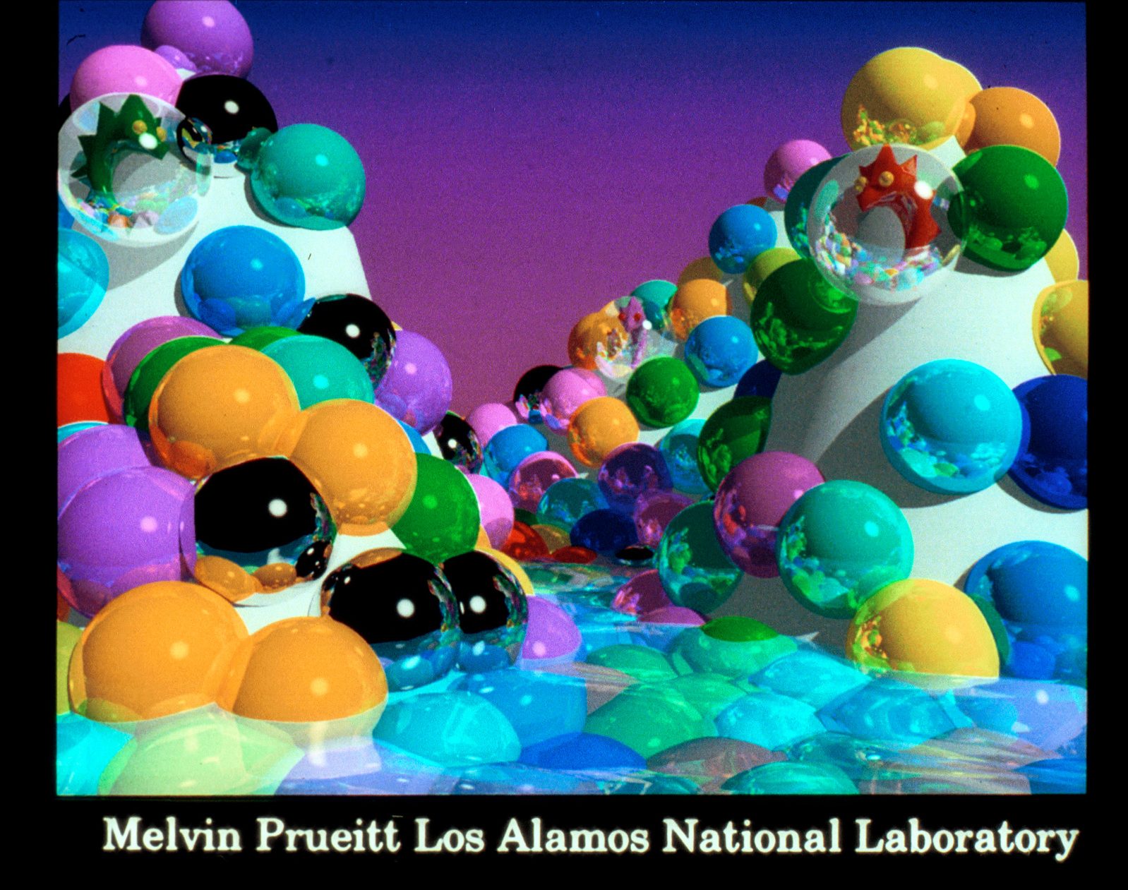 - Lake Shore Nest by Melvin L. Prueitt using his own software on a Cray computer and Dicomed film recorder. Life on a hypothetical planet. Eggs change color to absorb selected wave lengths of sunlight for “enzyme” synthesis. They turn clear just before hatching to allow the creature to become visually adapted to the world. Contact: Melvin L. Prueitt, Los Alamos National Laboratory, MS-D415. Los Alamos, NM 87545, (505)667-4452.?