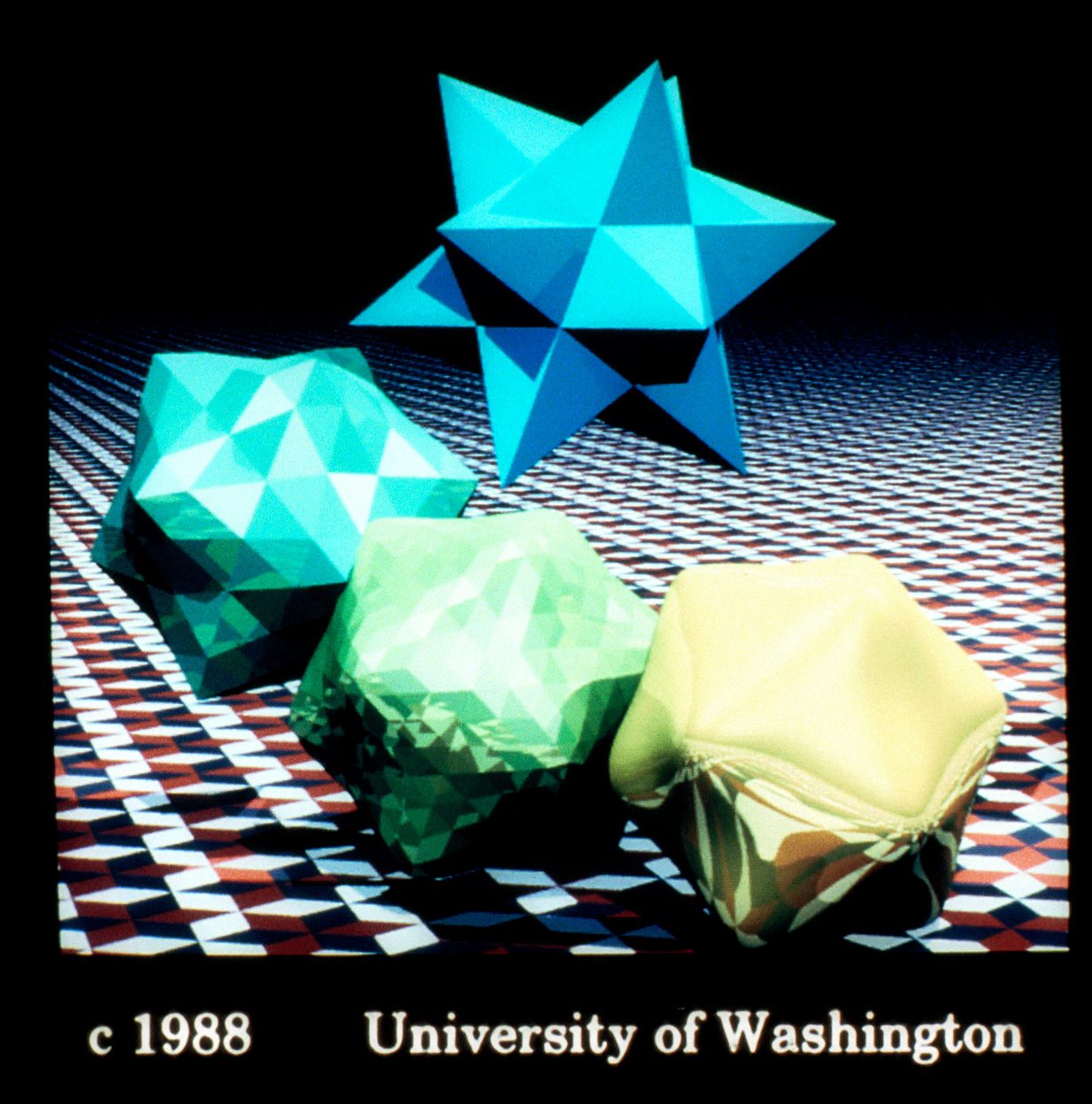 - Smooth Subdivision Surface based on Triangles by Gemini Lasswell and Charles Loop using an in-house modeling system and ray tracer on a VAX 8550 and an lkonas RDS 3000 frame buffer. A refinement operator has been iteratively applied to a stellated dodecahedron, resulting in a sequence of successively smoother approximation surfaces. This technique is a generalization of triangular B-spline refinement. Contact: Charles Loop, University of Washington, Department of Computer Science, FR-35, Seattle, WA 98195, (206)543-9349?