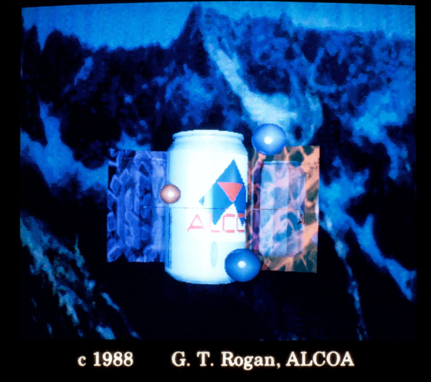 - Can in Mountain Setting by G.T. Rogan using experimental in house ray tracing program on a VAX with an Adage 3006 display. Digitized on an Amiga I 000. The aluminum can planes and spheres ray traced over digitized image with texture mapping, reflections and shadows. Contact: G.T. Rogan, ALCOA Technical Center, ALCOA Center. PA 15069, (412) 337-2366.?