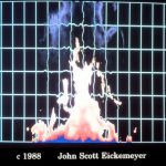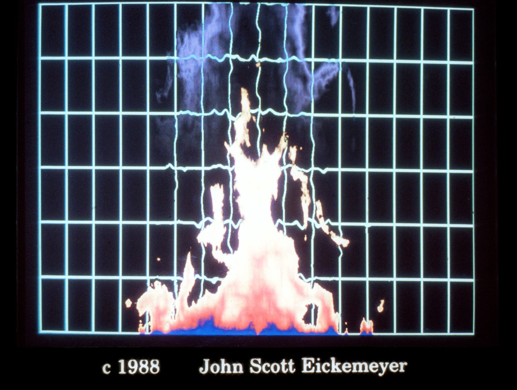 - Turbulent Campfire I by John Scott Eickemeyer with an Intel personal supercomputer (a 32 mode “hypercube” parallel processor): displayed on a Hewlett Packard 9000 workstation. This image was produced by adding “turbulence” to a proledirum definition of a non-turbulent campfire. The turbulence model is described in Ken Perlin’s papers in SIGGRAPH ’85. The flame and smoke were produced using Perlin’s “turbulence” function and the heat distortion of the background grid was produced using Perlin’s “Dnoise” function. The method is described in detail in the artist’s masters thesis. Contact: John Scott Eickemeyer, University of California, Computer Science Department. 801 Highland Avenue, Los Angeles, CA 90024. (213)825-3691.?