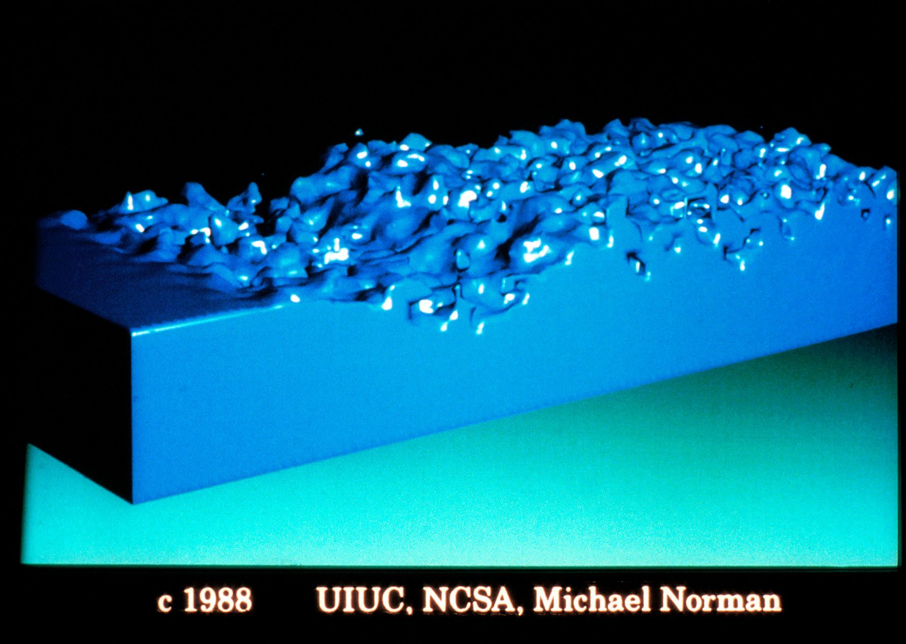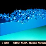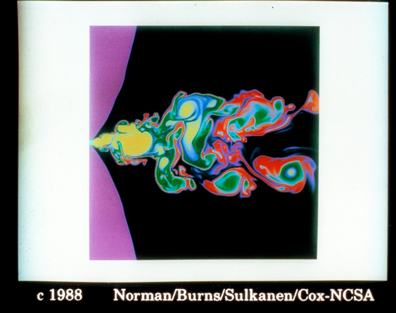 - Disrupted Jets from Active Galaxies by Michael Norman, Donna Cox, Martin Sulkanen and Jack Burns using ZUES, ICARE and Imagetool on the CRAY XM/P, Silicon Graphics 2400 and Sun workstation. Astronomers used the CRAY X M/ P supercomputer to explain why jets from some galaxies flare dramatically. The magnetohydrodynamics code solves the equations that describe the flow of a fluid or gas with magnetic fields using finite differences. A special color-map emphasizes the morphology of the simulation. As a jet with Mach number 2.5 passes through the shock wave, the jet abruptly slows and breaks up into a broadened subsonic plume whose morphology is strikingly similar to that of a radio lobe of a wide angle tailed galaxy. This research has given astronomers important clues about why jets from some radio galaxies flare into broad plumes while the jets from others remain remarkably straight and narrow. Contact: Donna Cox and Michael Norman, National Center for Supercomputing Applications, 605 E. Springfield Ave., Champaign, IL 61820, (217)244-0072.?