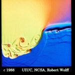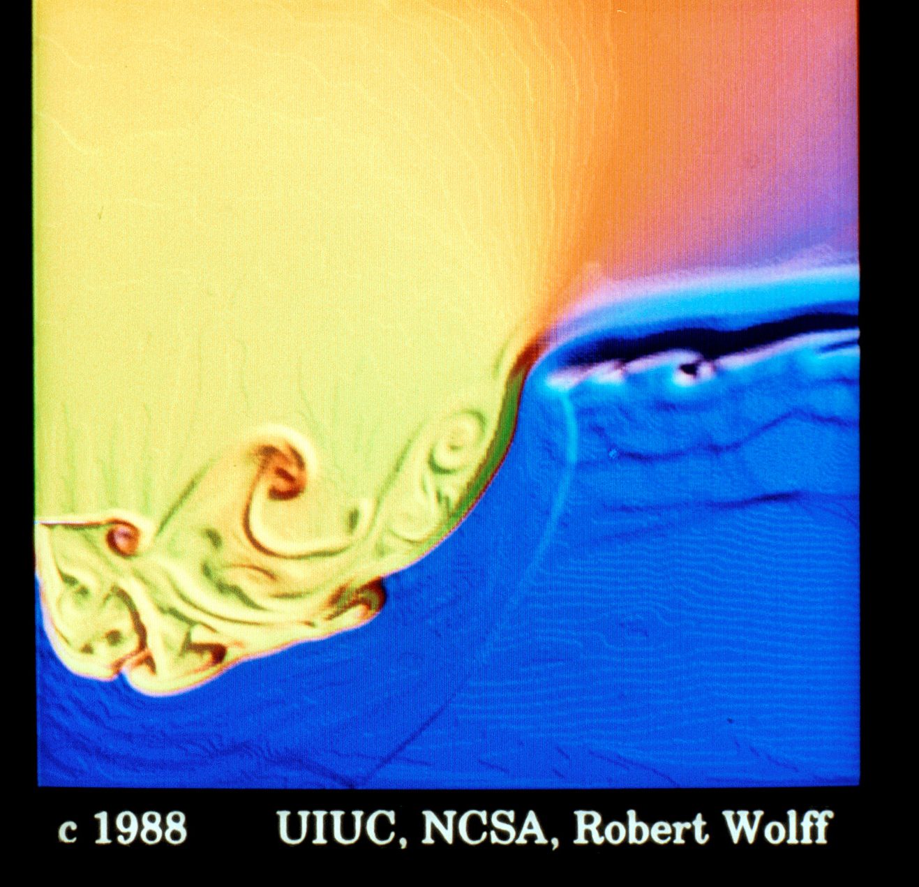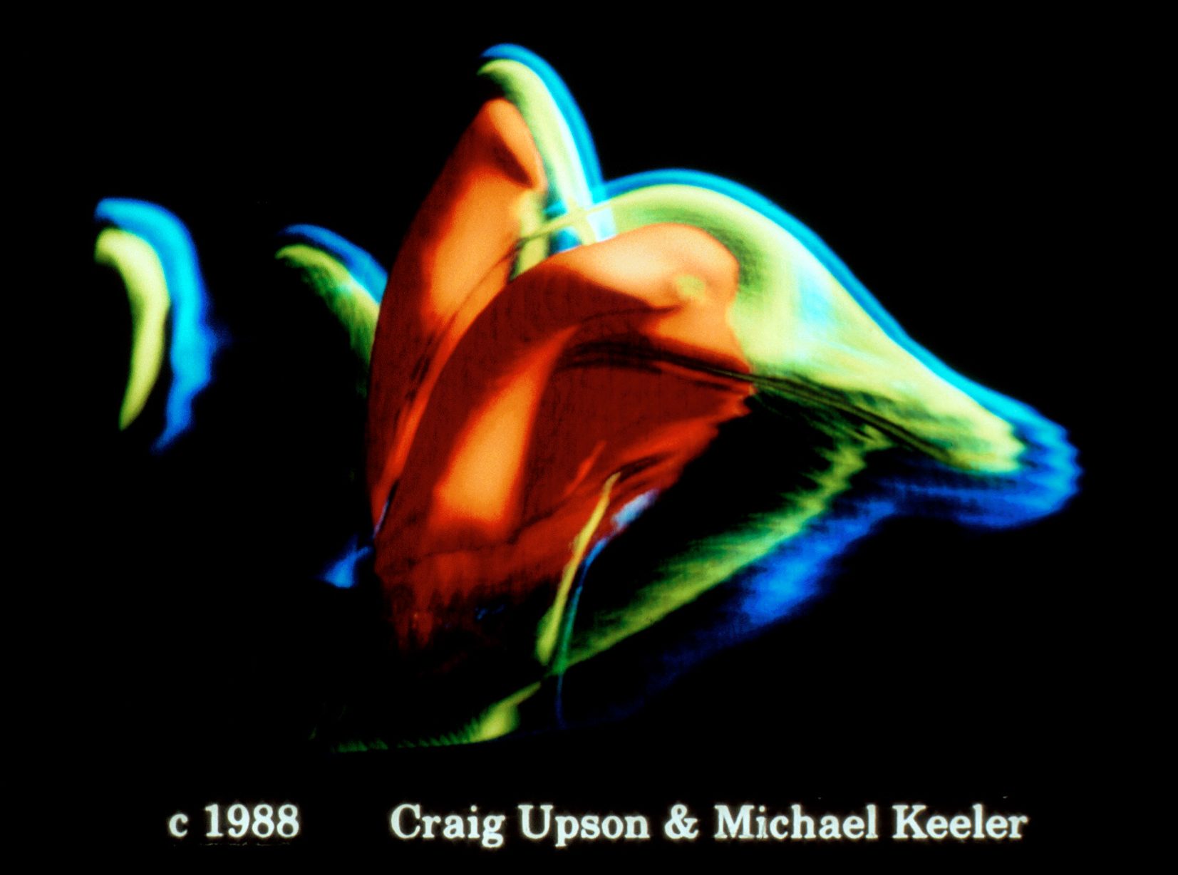 - 3-D Turbulent Shear Flow at Mach I.I by Craig Upson using Wavefront Technologies, SURF in-house surface contouring software on an Alliant FX-8 and Silicon Graphics IRIS 3130. Smoothed particle hydrodynamics simulation of a transonic mixing layer. Contact: Michael Norman and Craig Upson, National Center for Supercomputing Applications, I 52 Computing Applications Bldg., 605 E. Springfield Ave., Champaign, IL 61820, (217)244-6830.?