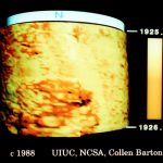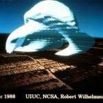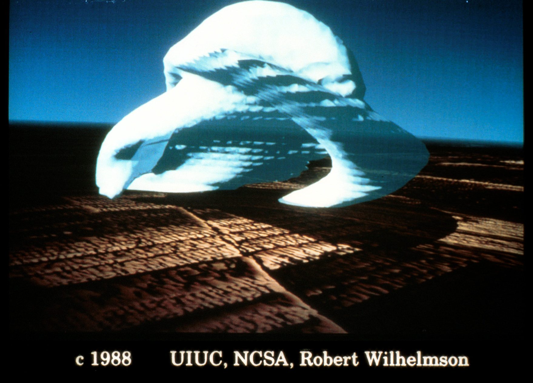 - Tornadic Thunderstorm by Stefen Fangmeier using Wavefront Technologies, SURF inhouse surface contouring software on an Alliant FX-8 and Si I icon Graphics IRIS 3130. The evolution and structure of a severe thunderstorm, which demonst rates the development of the classic radar “hook echo” characteristic of tornado formation. Contact: Stefen Fangmeier and Robert Wilhelmson, National Center for Supercomputing Applications, I 52 Computing Applications Bldg., 605 E. Springfield Ave., Champaign, IL 61820, (217)244-6830.?