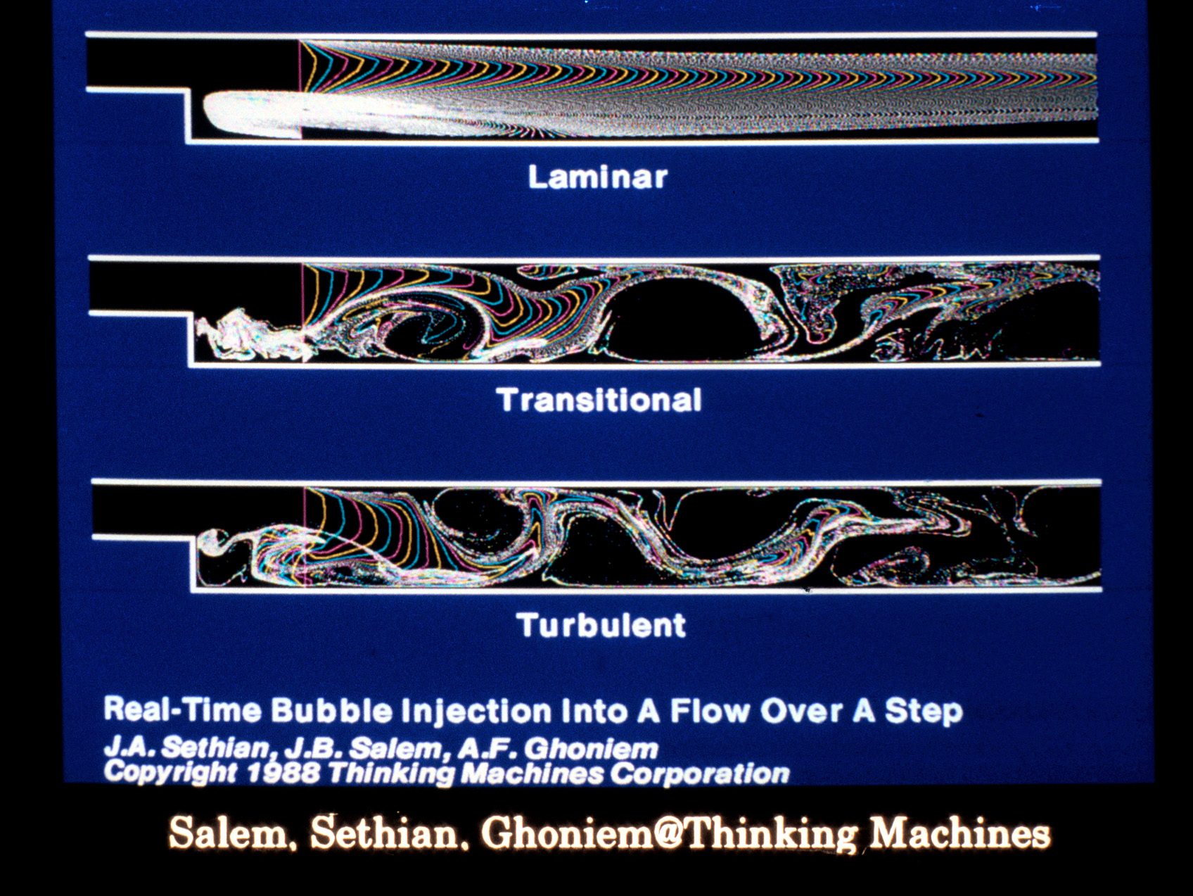 - Bubble Wire Injection into Several Types of Flow by James B. Salem, James A. Sethian and A.F. Ghoniem with Connection Machine Visualization Library on a Connection Machine model CM-2. The image shows the path of 80,000 particles injected into flows of various types. This slide contains a series of images produced during a real-time 2D fluid flow visualization. The 10 frames/second update rate is unique amongst flow visualization programs. In the program, each of several hundred thousand processors tracks the path of a dye particle injected into a simulated flow. Contact: James B. Salem, Thinking Machines Corporation, 245 First St., Cambridge, MA 02142, (617)876-1111.?