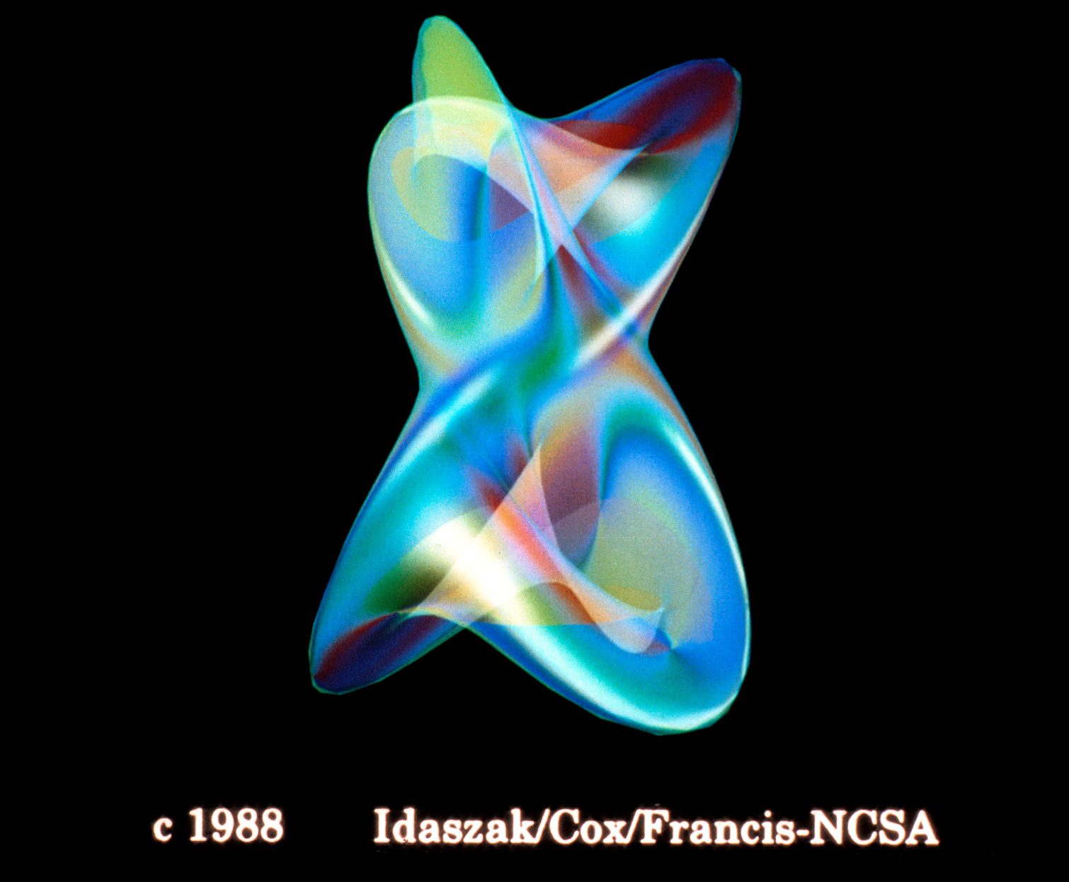 - Romboy Homotopy by Ray ldaszak, Donna Cox and George Francis using in-house software developed by Ray Idaszak and George Francis on the CRAY XMP/48, Alliant FX/80, Silicon Graphics IRIS 4D/70G. The Rom boy Homotopy is a complex deformation in four-dimensional space. The parameterization was created by Francois Apery in 1984 and extended by Professor George Francis. This was the first visualization of the homotopy and resulted in a discovery of a new surface. The shading algorithm used to render these surfaces is unique in that it can corrrectly smooth-shade singlesided surfaces (e.g. mobius strips, et al) as depicted here. Contact: Ray Idaszak, Donna Cox and George Francis, National Center for Supercomputing Applications, 605 E. Springfield Ave., Champaign, IL 61820, (217)244-0072.?