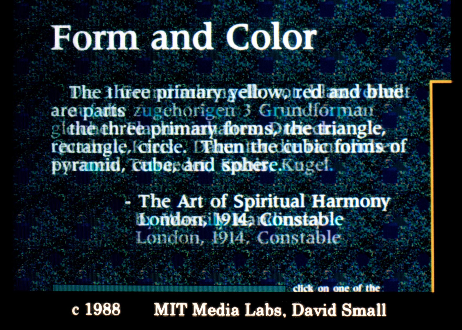- Active Translation by David Small. Book, electronic book design and transfont by David Small, on a Hewlett-Packard 9000 “Bobcat” workstation. Fading text using translucency allows the userto bring forward a linked text without creating a new window or negating the page design. Contact: David Small, Visible Language Workshop, Media Lab, MIT, 20 Ames St., Room El5-443, Cambridge, MA 02139, (617)253-4416.?