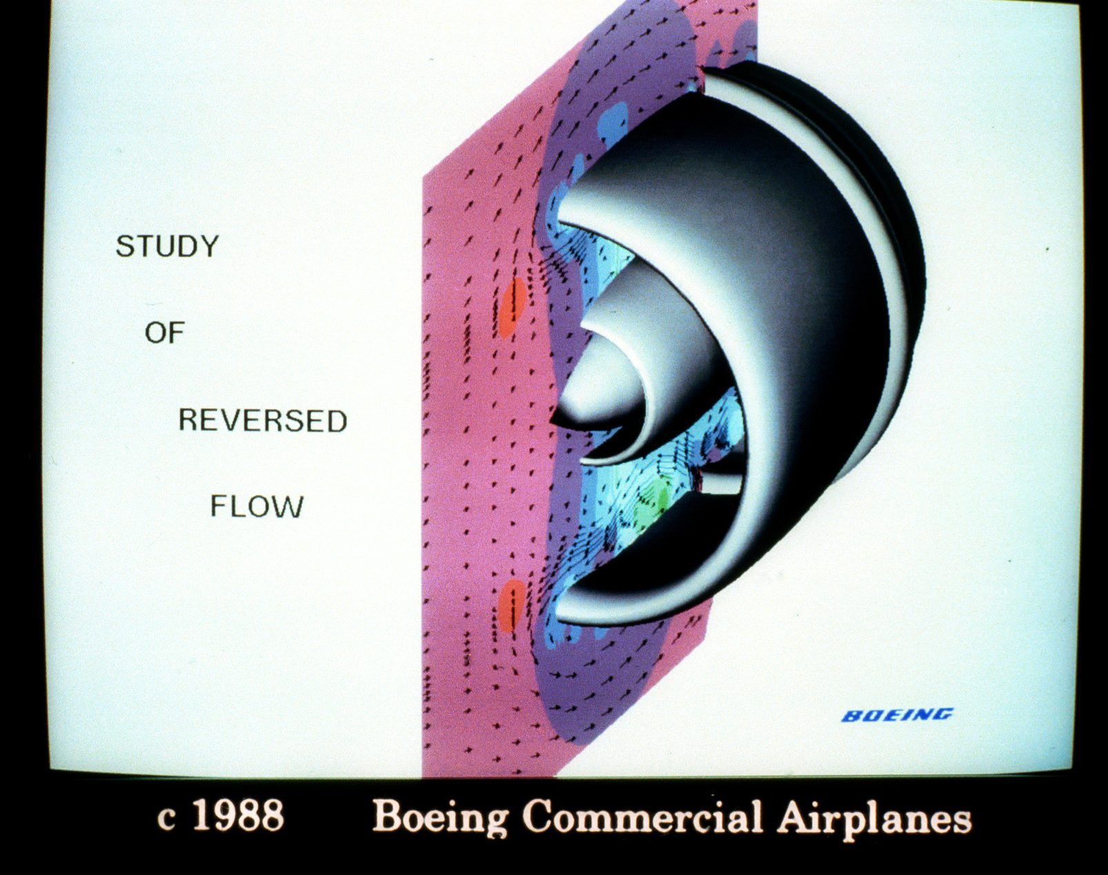 - Study of Reversed Flow by Wayne R . .Jones and Tom Tenerowicz using in-house software on a CRAY XMPwith images on an IRIS 3130. Naview-Stokes CFO solution of a reversed pitch fan flowfield. The analysis models the flow behavior in a very high bypass ratio transport engine during landing. Contact: Wayne R. Jones, Boeing Commercial Airplanes, P.O. Box 3707, M/S 7C-36, Seattle, WA 981242207, (206) 865-6202.?