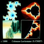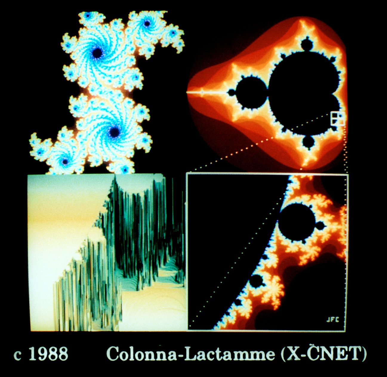 - Untitled by .Jean Francois Colonna made with his own software on Bull SPS9 computer and his own frame buffer. This slide shows excerpts from a pedagogical film about fractal sets, upper right Mandelbrot set, lower right 2D magnification of the window, lower left, 3D magnification of the window, upper right, Julie set for the center of the window. Contact: .Jean Francois Colonna, LACTAMME, Ecole Polytechnique, 91128 Palaiseau CEDEX, France, 33 I 60 19 40 53.?