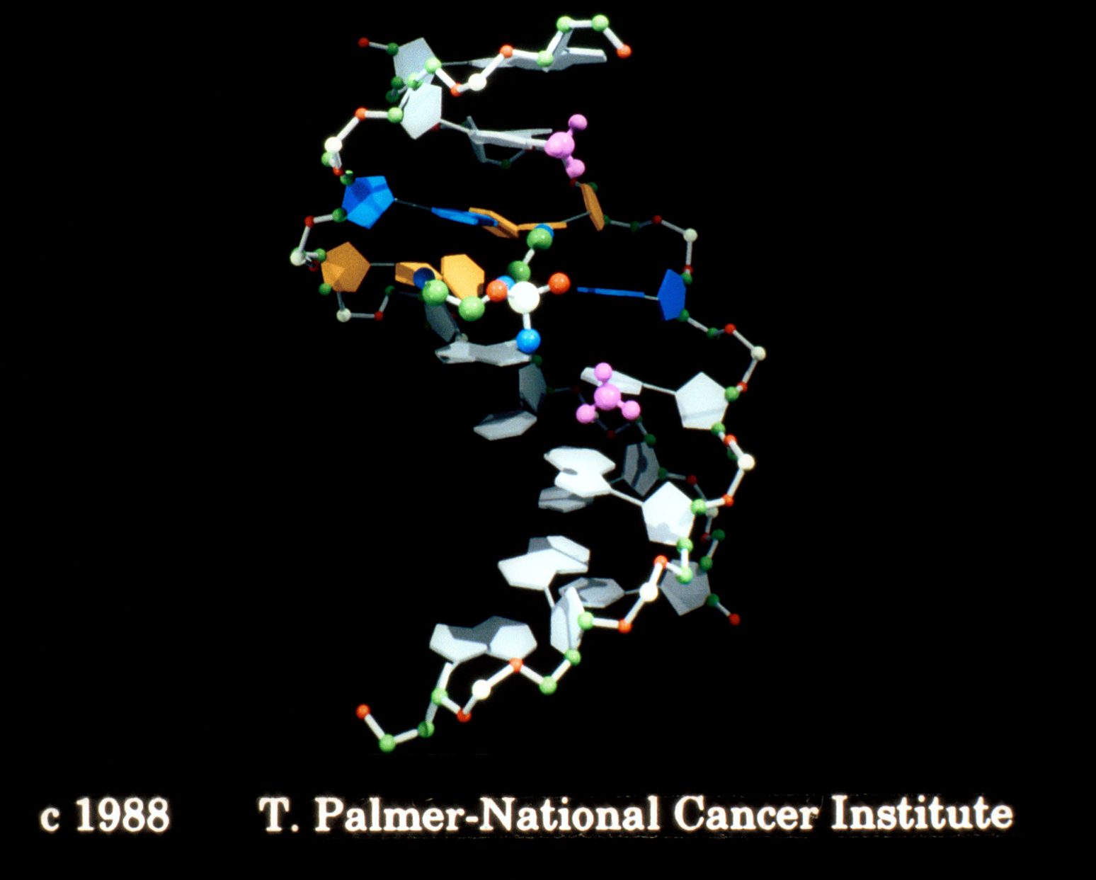 - Simulated Cytotoxic Anticancer Drug-DNA Crosslink by Thomas C. Palmer with locally developed modeling and ray tracing software on a Silicon Graphics IRIS 4D/60T A schematic visualization of a simulated covalent attachment of the anticancer drug phosphoramide mustard between two strands of helical DNA. The formation of this interstrand crosslink to the D ‘A in cancer cells renders the strands inseparable resulting in cell death. This structure was calculated using molecular dynamics methods on a Cray X/ MP. Molecular data: Dr. Frederick Hausheer. Visualization: Thomas C. Palmer and Dr. Frederick Hausheer. Contact: Thomas C. Palmer, National Cancer lnstitute-FCRF, P.O. Box B, Building 430, Frederick, MD 21701, (301)698-5797.?