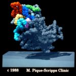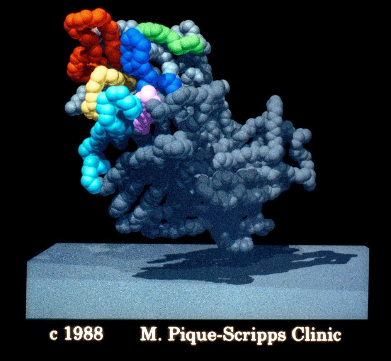 - Antibody Molecule by Michael Pique with “Tracer” from Ray-Tracing Corporation running on a Sun 3/ 160 workstation and a Seiko D-Scan frame buffer. Hypervariable loops (color) of protein make up an antibody molecule’s binding pocket. Illustration prepared for March 1988 Scienrific American article on catalytic antibodies. Rendered ( 1326 spheres, 3 lights, I 024xl 024 antialiased by adaptive supersampling) in 48 hours. Contact: Michael Pique, Research Institute of Scripps Clinic, Molecular Biology M 8-5, 10666 North Torrey Pines Road, La Jolla, CA 92037, (619) 457-9775.