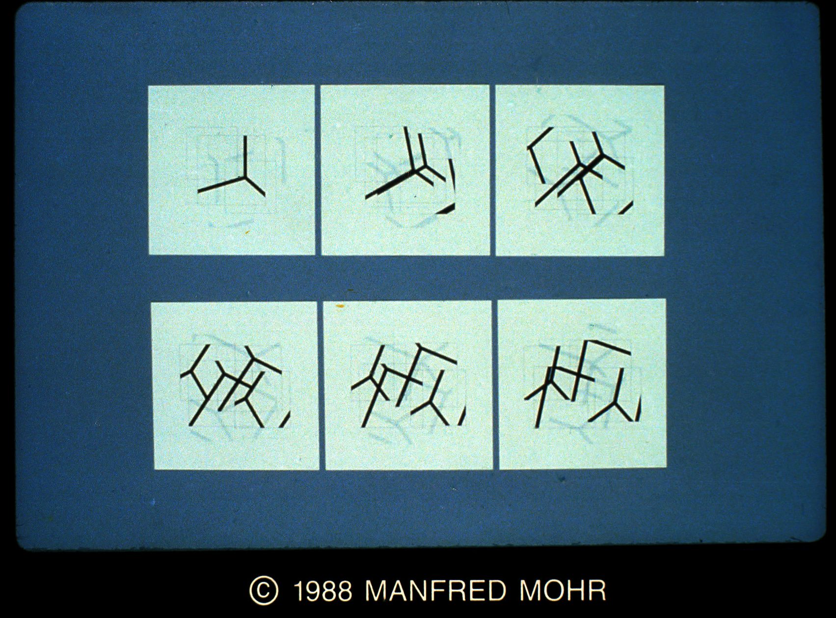 47. Manfred Mohr, 20 North Moore Street, New York, NY 10013; P-417- E; ink on paper (plotter drawing), series of 6, 8 x 8 in. each.
