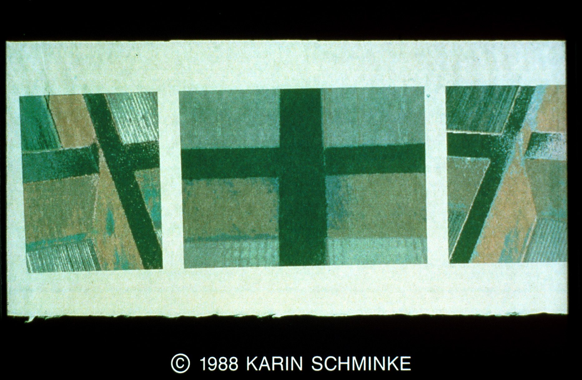 64. Karin Schminke, 4226 Esteban Road, Woodland Hills, CA 91364; Triple Cross; ink jet print on rice per, 8 x 23 in.