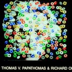 15&16. Papilloma Virus by Donna Cox, Stephen Meyers, Dan Sandin and Ellen Sandor. This visualization was created from visual data from electron microscope. Red capsids are aligned to a refracted, transparent icoahedral structure that is basic to many virus. The number of red capsomers were reduced to display the circular dsDNA. This virus is thought to be one of the major causes of cancer. Calculations were performed in the Electronic Visualization Laboratory, University of Illinois at Chicago, on the AT&T Pixel Machine. Initial collaborators were Stephen Meyers and Donna Cox. The resulting image was printed as a three-dimensional phscologram (a barrier strip method to create 3-D holographic-type transparencies). Dan Sandin and Ellen Sandor are the inventors of the phscologram process. Contact: Donna J. Cox, National Center for Supercomputing Applications, 605 East Springfield, Champaign, IL 61820, (217) 224-2005.?