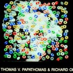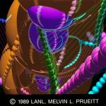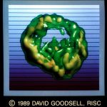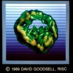 73&74. Einstein’s Face/Latent Square by Thomas V. Papathomas and Richard Oliveri. The images were created on the AT&T Pixel Machine, model PXM964d with PICLIB software. The left-eye and right-eye images, seen separately, appear identical; several donut-like objects of random color, position, orientation and shape are arranged on an (imaginary) flat, vertical cookie sheet. However, when the two images are fused stereoscopically, a square subset (6 x 6 donuts) in the center jumps out in front of the rest, creating a provocative visual illusion. The “donuts” were rendered with superquadric toroidal surfaces and they were Gouraud shaded using a single direct light source. The face was digitized at coarse resolution. Contact: Thomas V. Papathomas, AT&T Bell Laboratories, Visual Perception Research Dept., 600 Mountain Avenue, Room 2D551, Murray Hill, NJ 07974, (201) 582-4125, (201) 582-7308 FAX.?