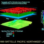 39&40. Untitled by Thomas D. Desmarais. This group of slides is a display of topography generated from elevation data and two subsurface layers generated from core samples. Gas production was also measured at each core site. The core sample data was smoothed and fitted to a 371 x 467 point grid. Surface fault features in the topography were identified and an analysis was made to determine possible fault planes. The intersection of these fault planes is thought to be a likely location for increased gas production. All slides were rendered on a Silicon Graphics 4D/60T workstation and imaged on a Matrix camera. Contact: Thomas D. Desmarais, Battelle Pacific Northwest Laboratories, P. 0. Box 999, Richland, WA 99352, (509) 375-2782, (509) 375-2718 FAX.?