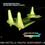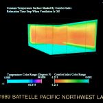 37&38. Untitled by Thomas D. Desmarais. This is an image taken from the output of a ventilation simulation for a two-room building. The building was modeled with a window on the front wall, three inlet vents on the floor, an outlet vent on the floor and a dividing wall with a thermostat controlling the state of the vent output. The ceiling, front and left walls are on the sunny side, while the floor and the other two walls are in the shade. The dimensions of the computational grid are 14 x 12 x 22 and flow velocity, temperature and a measure called comfort index were computed for each node. All slides were rendered on a Silicon Graphics 4D/60T workstation and imaged on a Matrix camera. Contact: Thomas D. Desmarais, Battelle Pacific Northwest Laboratories, P. 0. Box 999, Richland, WA 99352, (509) 375-2782, (509) 375-2718 FAX.?