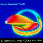 29&30. Hypersonic Vehicle Flow Field by Scott Lawrence. These slides show the pressure (represented by colors) on the surface of the hypersonic vehicle and on a cross section of the shock layer. Also shown is a simulated oil flow pattern. Magenta represents the highest pressure and blue the lowest. The code was a Parabolized NavierStokes solver (UPS). The conditions portrayed are Mach number of 12.4, angle of attach of 0.0 degrees and a Reynolds number of 0.22 x 106. The images were created and displayed on a Silicon Graphics Iris 3130 using GAS (Graphics Animation System). Slides were taken with a Dunn 635 camera. Contact: Gordon V. Bancroft, MS 258-1, NASA Ames Research Center, Moffett Field, CA 94035.?