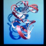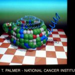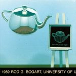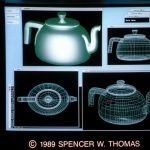 21 . Molecular Teapot by Thomas C. Palmer. This image displays various molecular visualizations mapped onto teapot data. The body and handle of the teapot are modeled with familiar CPK spheres. The spout was built by taking an amino acid sequence in alpha helix conformation and mapping it onto the spout curve. The lid consists of a supercoil of DNA. This primitive organism, teapoticus newellum, (seen here in its natural state) replicates infrequently throughout the year. In late July, however, it undergoes a frenzy of reproduction and has been known to mutate into a variety of forms. The image was created on locally developed modeling and ray tracing software and displayed on a Silicon Graphics Iris 4D/70GT workstation. Contact: Thomas C. Palmer, National Cancer Institute – FCRF, P.O. Box B, Building 430, Frederick, MD 21701, (301) 698-5797.
