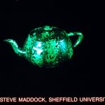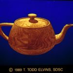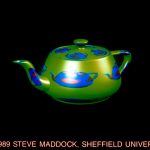 9. Turbulence on a Teapot by Stephen C. Maddock. The turbulence effect is procedurally generated by adding noise to alternate light and dark slabs of col.or. The image was generated using in-house software on an RM Nimbus PC with an Ikon 24- bit pixel engine (frame buffer). Contact: Stephen C. Maddock, Department of Computer Science, Sheffield University, Portobello Centre, Pitt Street, Sheffield, S 1 4DD U.K.