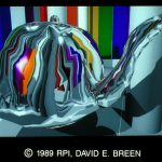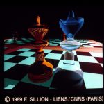 58. 1st Cartesian Vision by J.P. Thirion and M.P. Cani. Beam tracer software by J.P. Thirion and auto- matic generation of skin on skeleton by M.P. Cani. The software ran on the Bull SPS9 and Silicon Graphics Iris 3020. Beam tracing uses spatial coherence to improve ray tracing run time performance. All rays were computed using beams,. even relected, refracted and shadow rays. The curved surfaces are made with automatic skin generation system. Contact: Jean-Philippe Thirion, Laboratoire D’informatique de L’Ecole Normale Superieuve (L.1.E.N.S.), 45 rue d’Ulm, 75005, Paris, France, 33- 1-45-58-12-33.