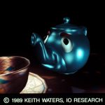 24. Spit the Pot by Keith Waters. One image of a sequence where Spit- the-Pot draws back his snout (using muscle controls) and spits tea into rhe cup. The software was “3D- Designer,” a package developed by IO Research Ltd. Contact: Keith \ arers, Schlumberger Lab for Com- purer Science, 8311 North RR 620, P.O. Box 200015, Austin, TX 78720-0015, (512) 331-3700.