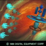 31. Outpost: Jupiter by Digital Equipment Corporation. This image demonstrates the use of PEX (PHIGS/PHIGS+ extension to X) in the x window system environment. PEX provides the support for 3D standards (PHIGS, PHIGS+, GKS- 3D) in the network environment of X. This image was created interactively in the X envirnnment with dxmodel, an in-house PEX test and demo utility. It illustrates the use of the smooth (Gouraud) shading, specular reflection, depth- cuing and hidden surface removal that are supported in PEX. The spacestation and gunstar models are courtesy of Digital Productions. The background image was digitized from a NASA/ JPL photograph of Jupiter’s Great Red Spot and was installed as the window’s background pixmap. The image was created on a VAXstation 3520 running an X server with the PEX extension and recorded using a Matrix QCR film recorder. Contact: Randi J. Rost, Digital Equipment Corporation, 100 Hamilton Avenue, Palo Alto, CA 9430 I, ( 415) 853-6721.