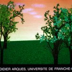45. Sundown by Didier Argues. An illustration from the author’s SIG- GRAPH ’89 paper. The image has a few big trees in front of the sun and little white clouds in the sky. Contact: Didier Argues, Laboratoire Informatique de Besancon, Univer- site de Franche-Comte, 16, Route de Gray, 25030 Besancon Cedx, France.