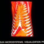 63. Tree Sloth by ChuckMosher and Ruth Johnson. The image was made using Yoxvu, the volume rendering tool 1ha1 comes wi1h the Sun TAAC- 1 application accelerator. This image is a shaded surface volume rendering of a 128 x 128 x 197 CT scan of a tree sloth. The opacity of various structures can be interactively modified to show the skin surface or to reveal internal structures. The bones of the rib cage, shoulder blades and spine can be seen in the image on the right, as well as the trachea, lungs, heart and diaphragm. The CT data is courtesy ofEric Hoffman, UPA. Contact: Chuck Mosher, Sun Microsystems, Inc.. P.O. Box 13447, Research Triangle Park, NC 27709, (919) 469-8300.