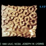 70. Acetylcholine Receptor by Julie Newdoll and Hans Chen. The ace- tylcholine receptor, solidly rendered from data gathered from three dimensional electron microscopy combined with x-ray profile data. Polygonal surface data was gener- ated by PRISM software, written by Hans Chen, UCSF Agard Lab, which was then fed into DORET on the Ardent Titan. Graphics and image created by Julie Newdoll. Electron density research done by Alok Mitra in the lab of Robert Stroud. The blue sections are the membrane of a cell, with the protein (acetylcholine receptor) shown in lavender, with a channel that receives acetylcholine (during nerve synapse). This protein comes in mirror image pairs (a pair of them is represented here). The image is clipped in Z to portray the theoretical arrangement of the 20 helix bundles that form the channel. Contact: Julie Newdoll, School of Medicine, Department of Biochemistry and Biophysics, University of California SF, San Francisco, CA 94143- 0448, (415) 476-3937. 71. Molecular Diffusion on Single Crystal Gold Surface studied by STM by Mark Bajuk, Joseph W. Lyding, Jerome S. Hubacek and Roger T. Brockenbrough. A scanning tunneling microscope is used to study the diffusion of physisorbed mole- cules on a single crystal gold surface. The Wavefront Technologies and in-house software were used running on the Alliant FX/80 computer and the Silicon Graphics Iris 3130 workstation. Contact: Daniel Brady, Scientific Visualization Program, National Center for Supercomputing Applications, 152 Computing Applications Bldg., 605 E. Springfield Ave., Champaign, IL 61820, (217) 244-2003.