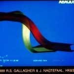62. A Time of Festival by Shinichi Takemura. ”I intended to express the happy time and joyfulness in the festival.” The curve forms in the picture are created by using a kind of sweep method along the double spiral lines. The outline of the shadow is diffused by using cell- automaton method. The image was made on an Epson 386 computer, Free-16 frame buffer and HC- I 000 digital video copy with software by the author. Contact: Shinichi Takemura, Science University of Tokyo, 1-14-18, Gohongi, Meguro-Ku, Tokoy, 153, Japan, (03)-712-0856.