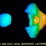 75. Microscopic NMR Chemical Shift Images by Marcelino L. Bernardo Jr., Paul C. Lauterbur and Mark Bajuk. Microscopic NMR image of a cross-section of a water- filled tube within a Imm tube of benzene displaying, with color coding, the water-benzene chemical shift and magnetic susceptibility distortion effects perpendicular to the spatial image plane. The Wavefront Technologies and in- house software were used running on the Alliant FX/80 computer and the Silicon Graphics Iris 3130 workstation. Contact: Daniel Brady, Scientific Visualization Program, National Center for Supercomputing Applications, 152 Computing Applications Bldg., 605 E. Springfield Ave., Champaign, IL 61820, (217) 244-2003.