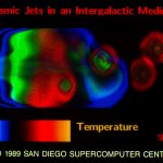 76. Cosmic Jets in an Intergalactic Medium-multiple Cloud by T. Todd Elvins. This is a frame from a movie. Radio observation of the heavens reveals energetic phenomena, like active galaxies with black holes at their cores, expelling jets of matter that extend across space for hundreds of thousands of light years. These jets often bend. While theory suggested that the jets bend around large-scale density inhomogeneties in the ambient medium-big clouds of cooler, denser plasma-the supercomputer simulation disproves this bending mechanism. The jets bum right through the clouds. Contact: T. Todd Elvins, Anke Kamrath, San Diego Supercomputer Center, 10100 Hopkins Dr., La Jolla, Ca 92037, (619) 534-5128, elvinst@sds.sdsc.edu.
