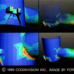 77. Tension Leg Platform Stress Intensity by Mark Smith and Olin Lathrop. Stress intensity is color coded on a small section of a tension leg offshore oil platform. Different views are shown totally opaque, and with stress intensity mapped to opaqueness. This combination is useful for quickly identifying areas of high interest, while still providing good context. Interactive setup and previewing was done on an Apollo ON IO000VS 80 plane system using the alpha buffering hardware. Final images were computed in software on the ON IO000 at 4K resolution and then filtered to the 2K resolution shown. The finite element analysis was done by ANSYS. The image was produced directly with FOTO, Cognivision’s generic data visualization program. Contact: Cognivision, Inc., 319 Littleton Road, Suite 100, Westford, MA 01886, (508) 392-088 I.