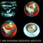 78. 3D Reconstruction of an Eye using Ultrasound Images by A. E. Dumke, F. L. Lizzi, D. J. Coleman, A. L. Rosado and R. H. Silverman. 3D surface rendering of an eye with traumatic injury showing v-shaped retinal detachment with a horizontal bridging membrane. Purple shaded surface represents inner surface of thickened choroid. Rendering was synthesized from 17 ultrasonograms (shown in upper left quadrant) obtained in parallel planes. The image was generated using the Adage 3000 image processor and DEC VAX 11/780. Riverside Research Institute in collaboration with Cornell University Medical College. Research supported in part by NIH Grants EY0 1212 and EY03 I 83. Contact: Anne E. Dumke, Riverside Research Institute, 330 West 42nd Street, New York, NY I 0036, (212) 502-1800.