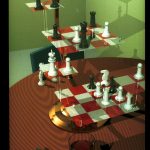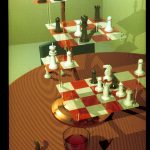 7&8. 3-D Chess #1 by Gregory J. Ward, Christopher Moll. This stereo pair is of a Star Trek ( TM) tridimensional chess game, view #1. It was created using RADIANCE custom ray tracing program for lighting simulation on a Sun 3/60 and a Dicomed. Contact: Gregory J. Ward, Lawrence Berkeley Laboratory, I Cyclotron Road, 90-3111, Berkeley, CA 94720, (415) 486-4757.
