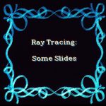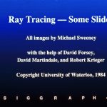 Slides 1 through 27. Produced by Michael Sweeney with the help of David Forsey, David Martindale and Robert Krieger, University of Waterloo. Copyright 1984, University of Waterloo. These are slides from the video, “Ray Tracing: A Silent Movie and Some Slides,” SIGGRAPH Video Review #14, 1985. They give a good introduction to the fundamental principles of ray tracing, and also have historical value. We suggest that interested instructors also get a copy of the Video Review for class use.