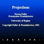 Slides 28 through 54. Produced by Norma Fuller and Przemyslaw Prusinkiewicz of the University of Regina. Copyright 1991, Fuller and Prusinkiewicz. This series contains 26 slides illustrating various aspects of projections for computer graphics. After the introduction slide (#28), the slides illustrate the following principles.