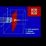 40. In this case all three axes are cut by the projection plane. So we have three-point perspective. In perspective projections any set of parallel lines which are not parallel to the projection plane will converge to a vanishing point. If the set of lines is parallel to one of the principal axes, the point is called a principal vanishing point. There are at most three principal vanishing points.