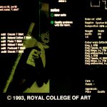 The SIGGRAPH ’93 designing technology slide set showcases the convergence of design and technology and explores how these disciplines have advanced functionality, communication, and usability. It emphasizes the designer’s role in the development process. The 55 slides are printed here in black and white to facilitate locating information about the images. The full color 35mm slide set can be ordered from: ACM order department, P.O. Box 64145, Baltimore, MD 21264; l-800-342-6625. The ACM order number for the SIGGRAPH ’93 designing technology set is 915931. The cost is $39 for members; $50 for non-members. Catalog number and title Creator (if different than contact) Contact information