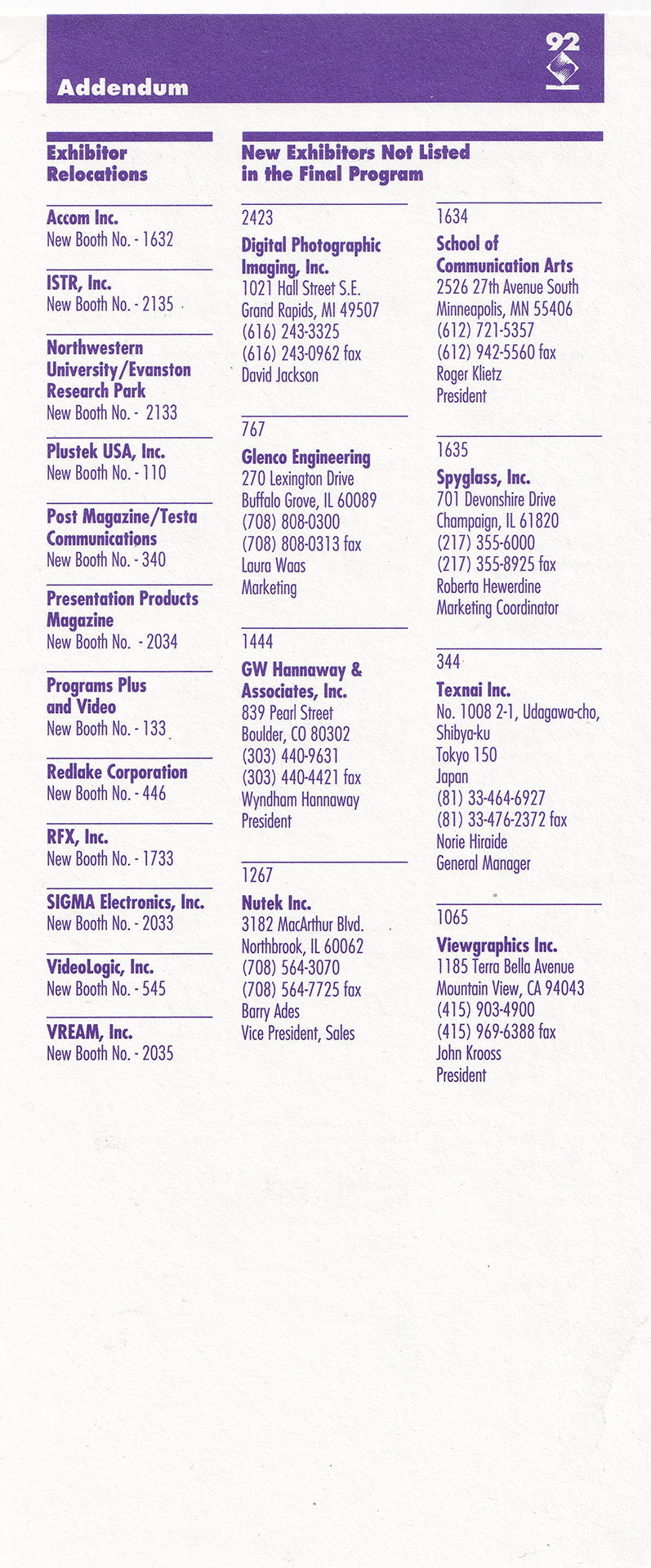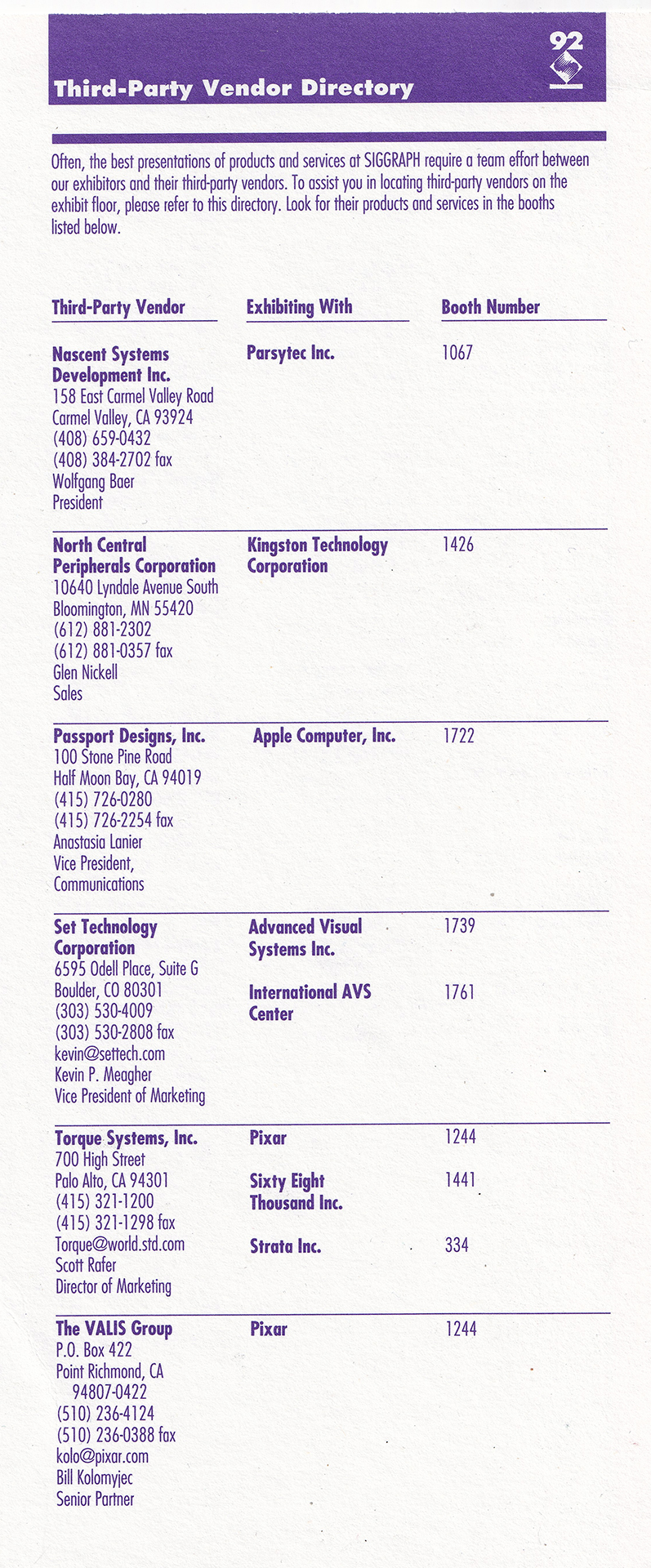 This one page, double-sided insert contained additional exhibitors and third-party vendors for the SIGGRAPH 1992 exhibition.