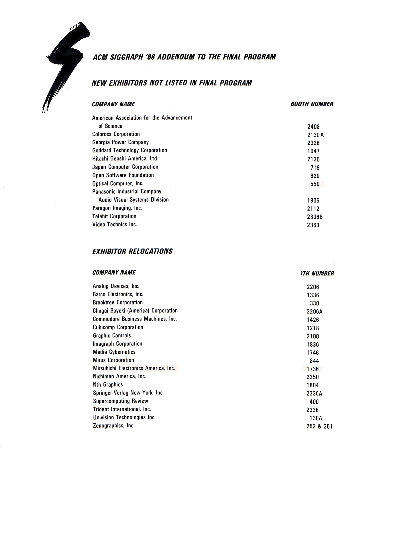 This one-page addendum contained a list of exhibitors that were not listed in the program and also a list of exhibitors that were relocated to a new location in the exhibition hall.
