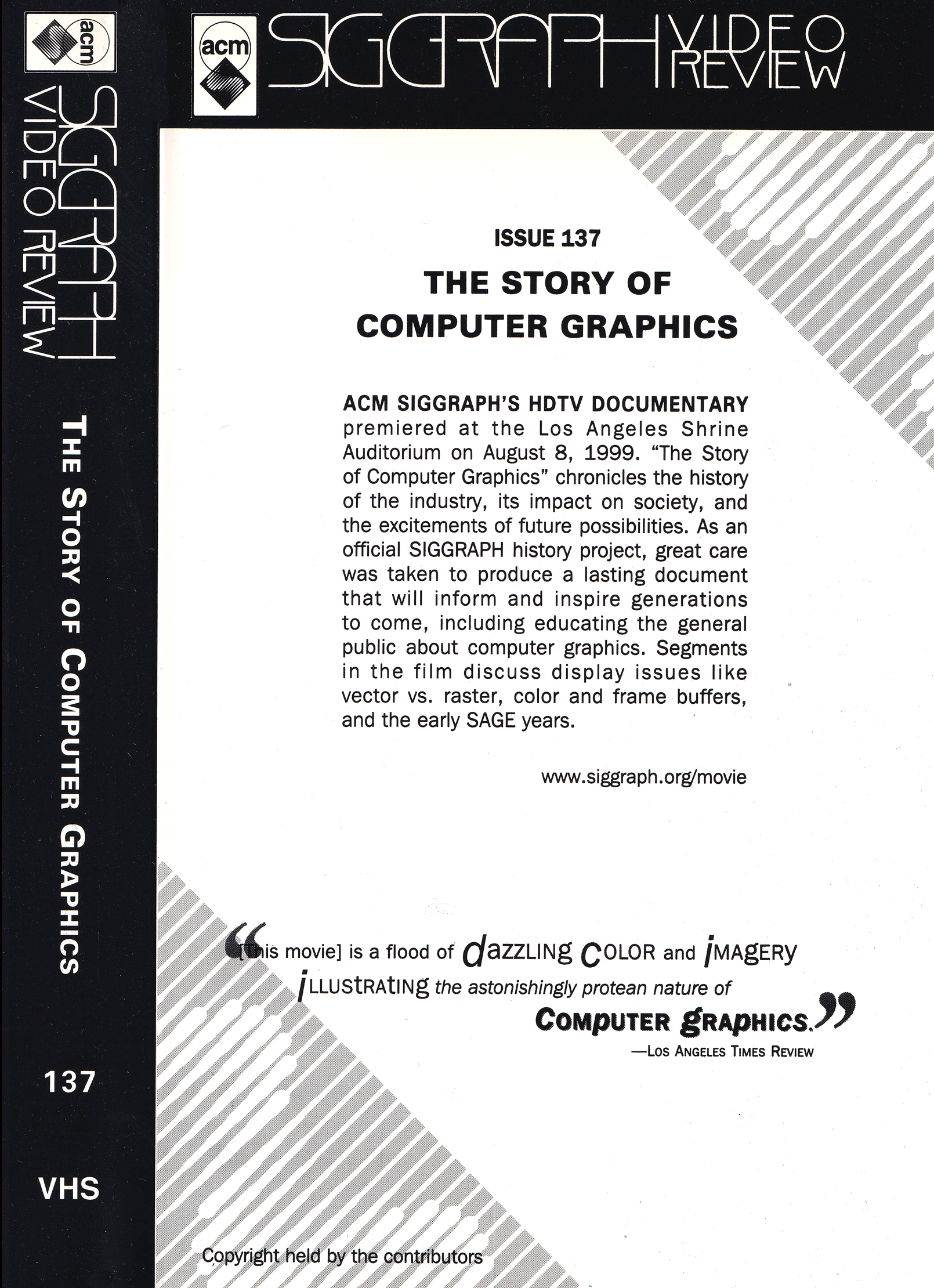 ACM SIGGRAPH’s documentary, which premiered at the Los Angeles Shrine Auditorium, on August 8, 1999, “The Story of Computer Graphics” chronicles the history of the industry, its impact on society, and the excitements of future possibilities. As an official SIGGRAPH history project, great care was taken to produce a lasting document that will inform and inspire generations to come. One of the main goals of the documentary is to help educate the general public about computer graphics. There are segments in the film which talk about display issues like vector vs raster, color and frame buffers and the early SAGE years. Los Angeles Times review says it “is a flood of dazzling color and imagery illustrating the astonishingly protean nature of computer graphics.” www.siggraph.org/movie